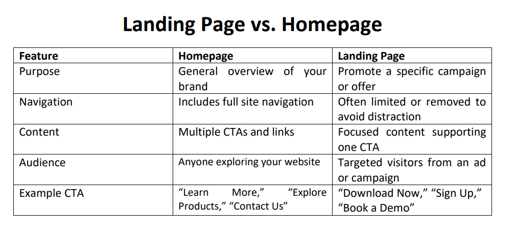 Unlike a homepage, which encourages users to explore, a landing page is focused on a single call-to-action (CTA) — such as signing up, downloading a resource, or making a purchase.