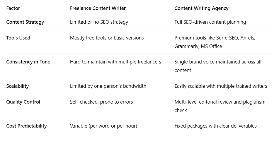Unlike individual freelancers, content writing agencies offer a structured approach and a complete content ecosystem designed for scalability and quality. Here’s why agencies are the better choice: